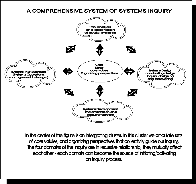 SYSTEMS INQUIRY is a system itself. As a conceptual system, it has four interrelated and internally consistent aspects acting as a whole: systems PHILOSOPHY, systems THEORY, systems METHODOLOGY and systems APPLICATION. Furthermore, systems inquiry embraces two kinds of disciplined inquiry; it's conclusion-orientated inquiry mode PRODUCES systems knowledge, its decision orientated inquiry mode APPLIES systems knowledge to the formulation and selection of systems methods that address real-world situations. "As a conceptual system, it has four interrelated and internally consistent aspects."
