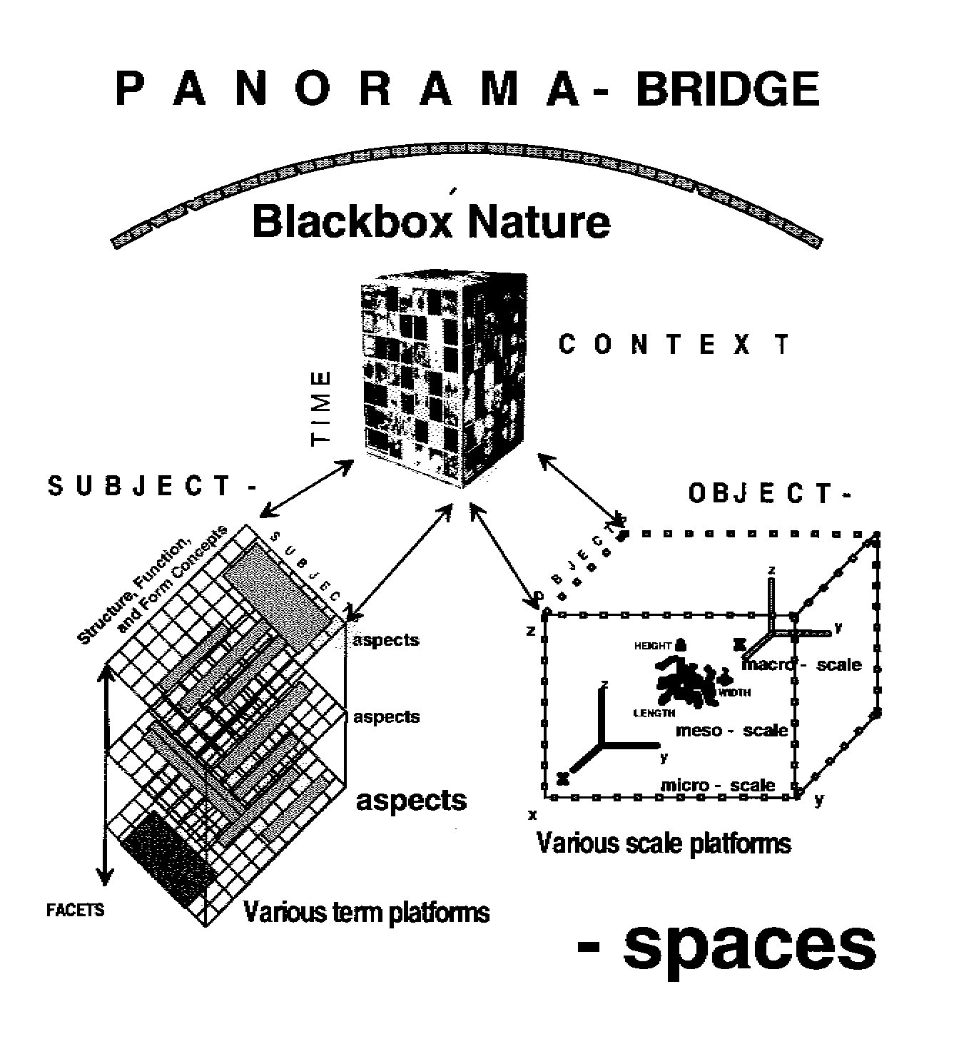 The centrepiece of the proposed Panorama of Knowledge and meta-knowledge is called Blackbox Nature and can be understood as a mirror or translator between objects and subjects (see Jung/Pauli). The proposed architectonic of open real or abstract spaces links entities (real and abstract objects) and concepts into a common context or layout (PANORAMA).